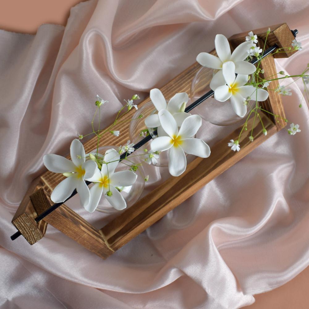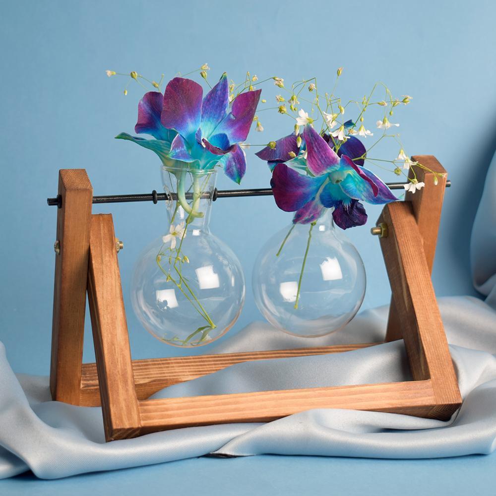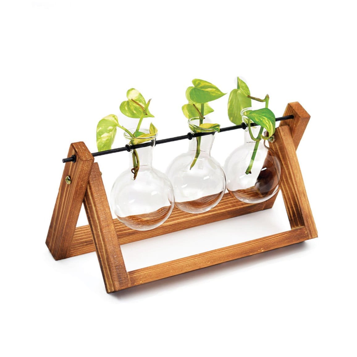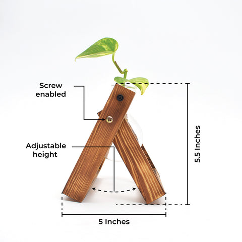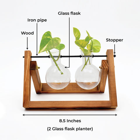 Round bottom flasks hanging on a wooden tray, perfect for those science enthusiasts! Our flask planters have a Minimal style using organic materials and a touch of modernity are perfect decor pieces for all spaces- indoor or outdoor. nThe ideal decor piece to be kept on your side table, balconies, or even study tables, these flask planters bring a sense of style and calmness together.