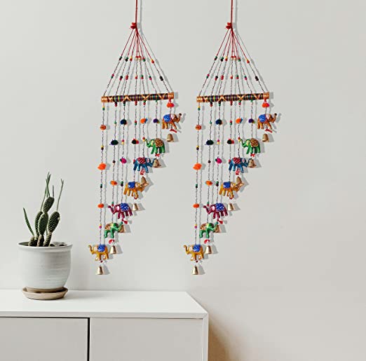 PALPAL Art Gallery Home Decoration Items Paper mache Elephant Wind Chimes/Safe Combo Set of 2 Home Decoration for Hall balcony Wall/Door/Window Hanging Bells (101 cm Multicolour)